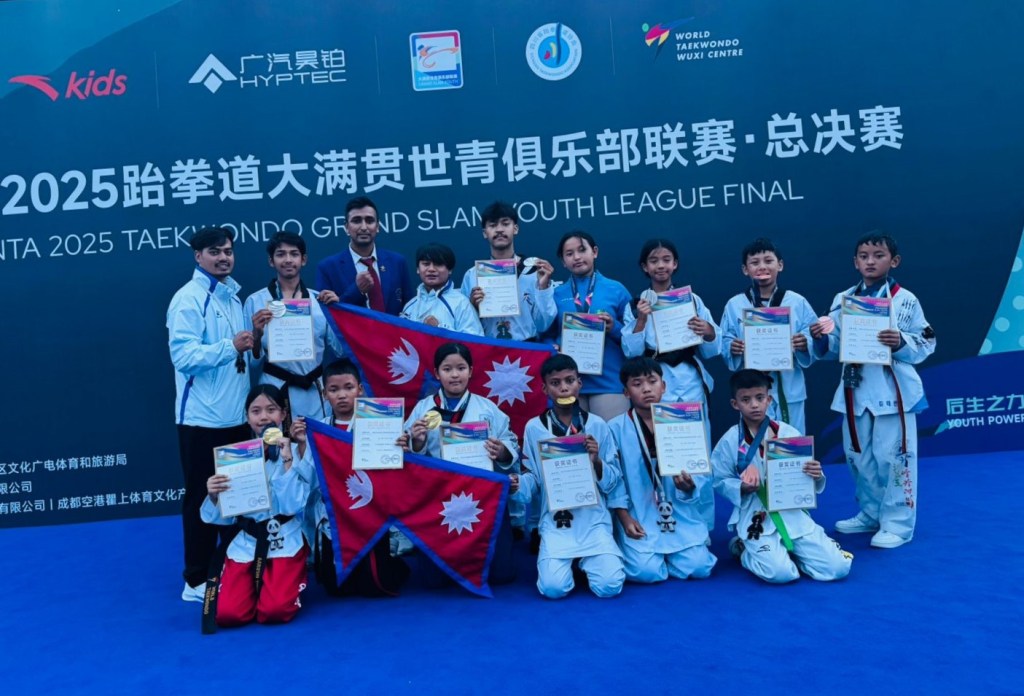 नेपाली खेलाडीले एन्टा २०२५ तेक्वान्दो ग्रान्डस्लाम युथ लिग फाइनलमा १३ पदक जितेका छन् । नेपालले ५ स्वर्ण, ३ रजत र ५ कांस्य जितेको काठमाडौं जिल्ला तेक्वान्दो संघका अध्यक्ष विक्रम खड्गीले जनाएका छन् ।