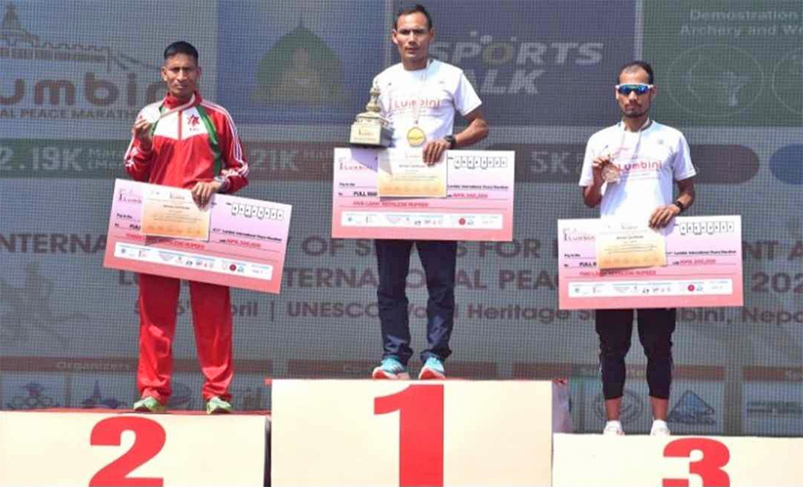 लुम्बिनी अन्तर्राष्ट्रिय म्याराथनको उपाधि तीर्थ पुनले जितेका छन् । शनिबार सम्पन्न भएको म्याराथनमा पुनले निर्धारित ४२ दशमलब १९५ किलोमिटरको दुरी २ घण्टा २० मिनेट ४९ सेकेन्डमा पूरा गर्दै उपाधि जितेका हुन्।